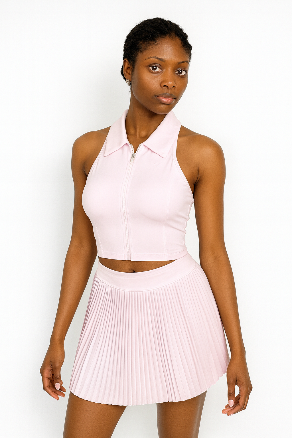 Paired with the elegant pleated skirt, the set creates a timeless athletic look that looks beautiful on and off the court.